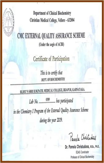 Registered with National External Quality Control Programme, CMC Vellore. Since 1997 for Monitoring and evaluating biochemical Investigations (Monthly Monotring of Quality control Samples).