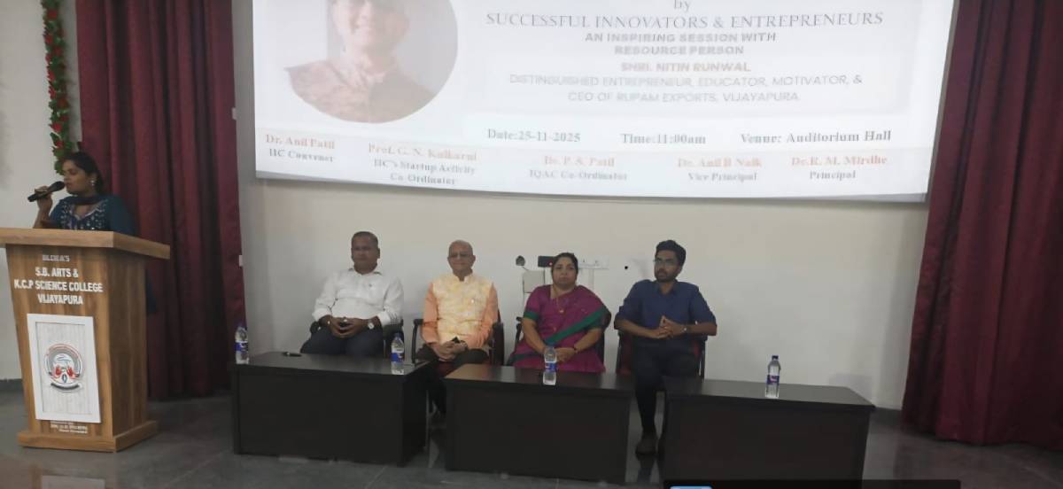 Under the initiation of Institution Innovation Council and IQAC, the Start-up Activity cell organized “Motivational Expert Sessions by Successful Innovators and Entrepreneurs” an inspiring session with Shri Nitin Runwal, distinguished entrepreneur, educator, motivator and CEO of Rupam Exports, Vijayapur. The session was graced by the presence of Shri Nitin Runwal, resource person; Dr. R. M. Mirdhe, Principal; Dr. P. S. Patil, IQAC Co-ordinator and Dr. Anil Patil, IIC Convener. The session started with the invocation by the student of M. Sc. CS Program Miss. Naina Uttareshwar followed by welcoming the dignitaries and introduction of the guest to the august gathering by Prof. Soumya Sajjan, Department of PG studies in Physics. It further proceeded with the talk by our resource person Shri Nitin Runwal. In his talk the guest showed through different real time stories; the importance of hard work, dedication, consistency as well as determination for achieving the goals.