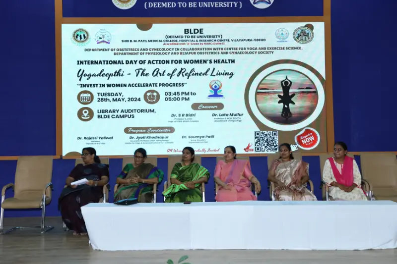 On the occasion of International Day Of Action For Women’s Health, the Department of Obstetrics & Gynecology in collaboration with the Centre for Yoga and Exercise Science, Department of Physiology, and BOGS Society Vijayapura executed the program “Yogadeepthi – The Art of Refined Living,” on 28th May 2024, in the library auditorium for the Teaching, Non-teaching Staff members and PG students of BLDE(Deemed to be University).