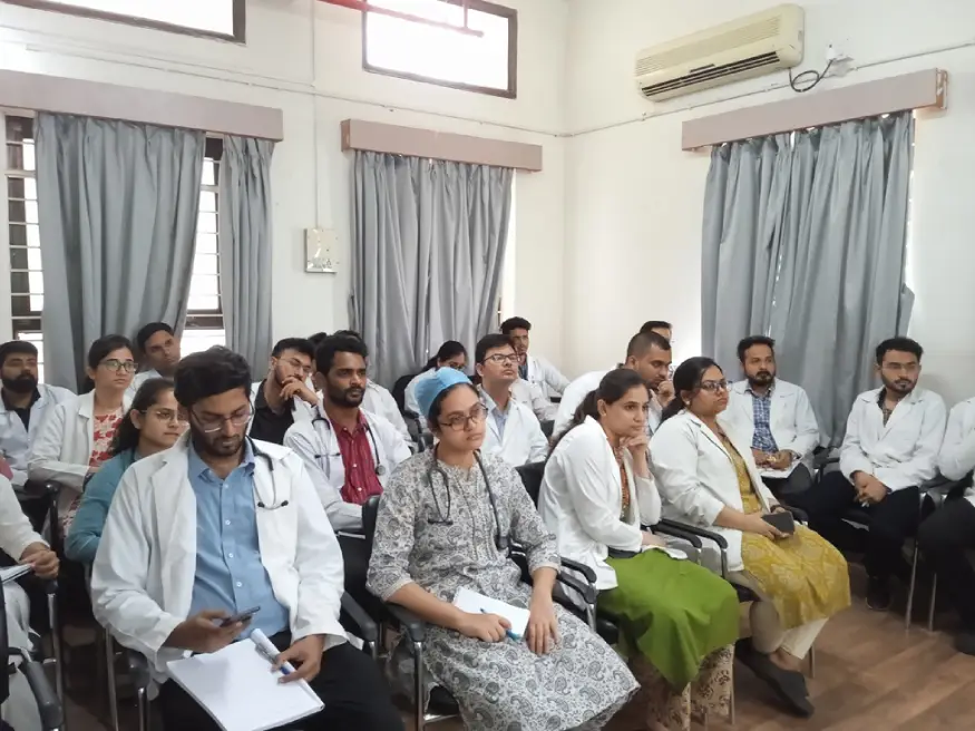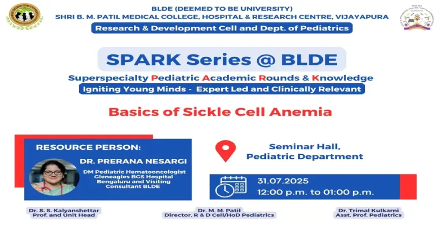 On 31st July 2025, the Department of Pediatrics organized a SPARK Lecture Series on the topic Basics of Sickle Cell Anemia at the Dr. C. R. Bidri Seminar Hall, Hospital, 2nd Floor, Vijayapura. The session, held between 12:00 pm and 1:00 pm, was delivered by Dr. Prerana Nesaragi, Consultant in Pediatric Hematology, Oncology, and BMT. All postgraduate students and staff of the department attended the lecture, which was part of the Academic category of events. Dr. Nesaragi concluded the session by discussing ideas for her next visit. A total of 10 postgraduate students and staff members participated.