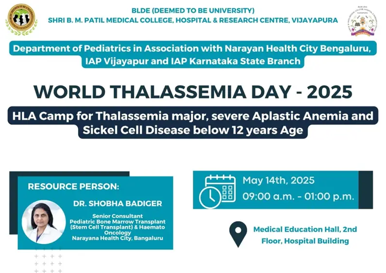 DESCRIPTION/OVERVIEW On 14th May2025  From 9 am to 1 pm   Dr.Shobha Badiger, visiting senior Consultant in pediatric bone marrow transplant (stem cell transplant) and Hematology Oncology, conducted Camp on thalassemia and HLA typing camp in thalassemia major, aplastic anemia and sickle cell anemia children below 12 years, in medical education unit and total 43 patients had come for consultation.   All the parents were given awareness about how thalassemia can be prevented during subsequent pregnancy in the same mother. Dr.Shobha also simplified the  definitive treatment aspect of thalassemia i.e BONE MARROW TRANSPLANTATION. Couple of parents expressed gratitude towards Dr.Shobha and doctors of paediatrics department, especially HOD Dr. M.M Patil sir who for helped during and after the process of bone marrow transplantation from BLDE institution. .after this many patients were included in the camp of HLA typing for further treatment. Stem cell register was  updated.