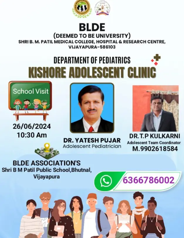 On 26/6/2024, a team of doctors (KISHORE CLINIC) visited Shri B.M.Patil Public as a part of our school outreach program aimed at promoting health awareness among school Adolescent children. The visit was organized in collaboration with Dept, of Pediatric, SBMPMC & KISHORE CLINIC. The objective of the visit was to conduct health screenings, provide health education, and address any health concerns among the Adolescent students.