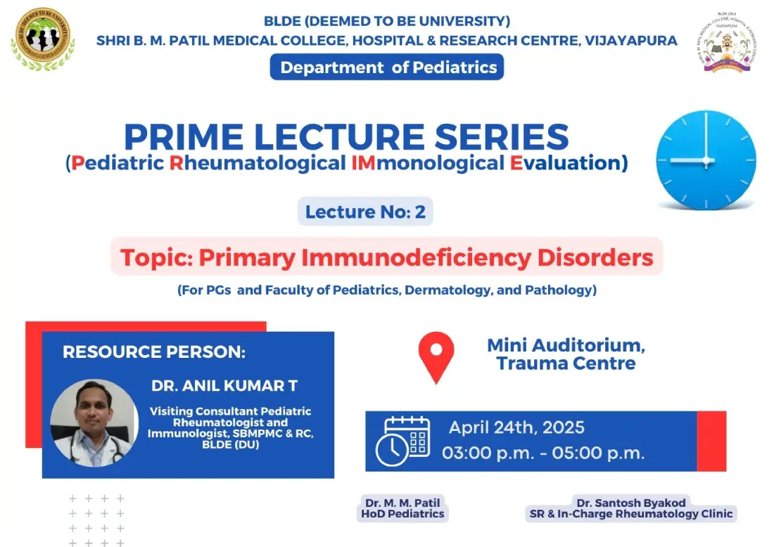 DESCRIPTION/OVERVIEW On 13th May 2025 in morning session Dr. Prerana Nesaragi Conducted visit in   OPD saw Total 3 patients in the afternoon madam went on  to deliver her lecture  on the bone marrow transplant and its prospects in pediatrics in the department of pediatrics between 12-1pm. All the post graduates and staff of the department attended the series. Madam left after discussing  the ideas for her next visit