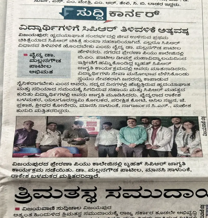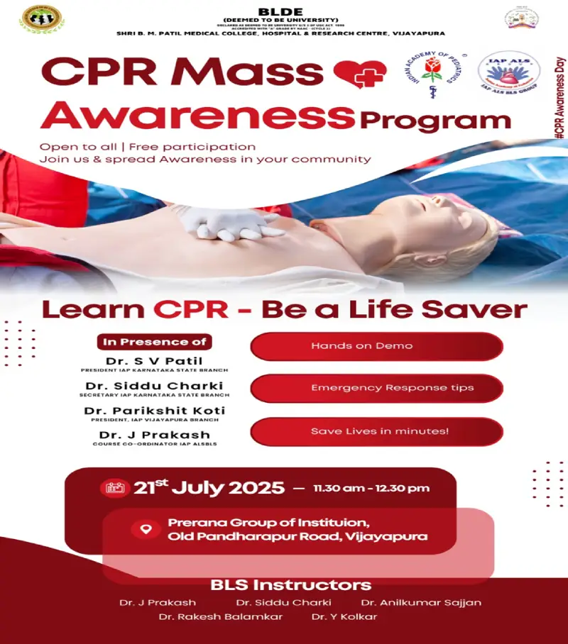 On 21st July 2025, the Department of Pediatrics, BLDE (Deemed to be University) organized a special event titled CPR Mass Awareness Program” under the category of Observation Day, marking CPR (Cardio Pulmonary Resuscitation) Awareness Day. The program was conducted at Prerana Group of Institutions, Vijayapura, in collaboration with IAP Vijayapura.