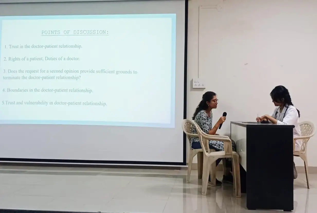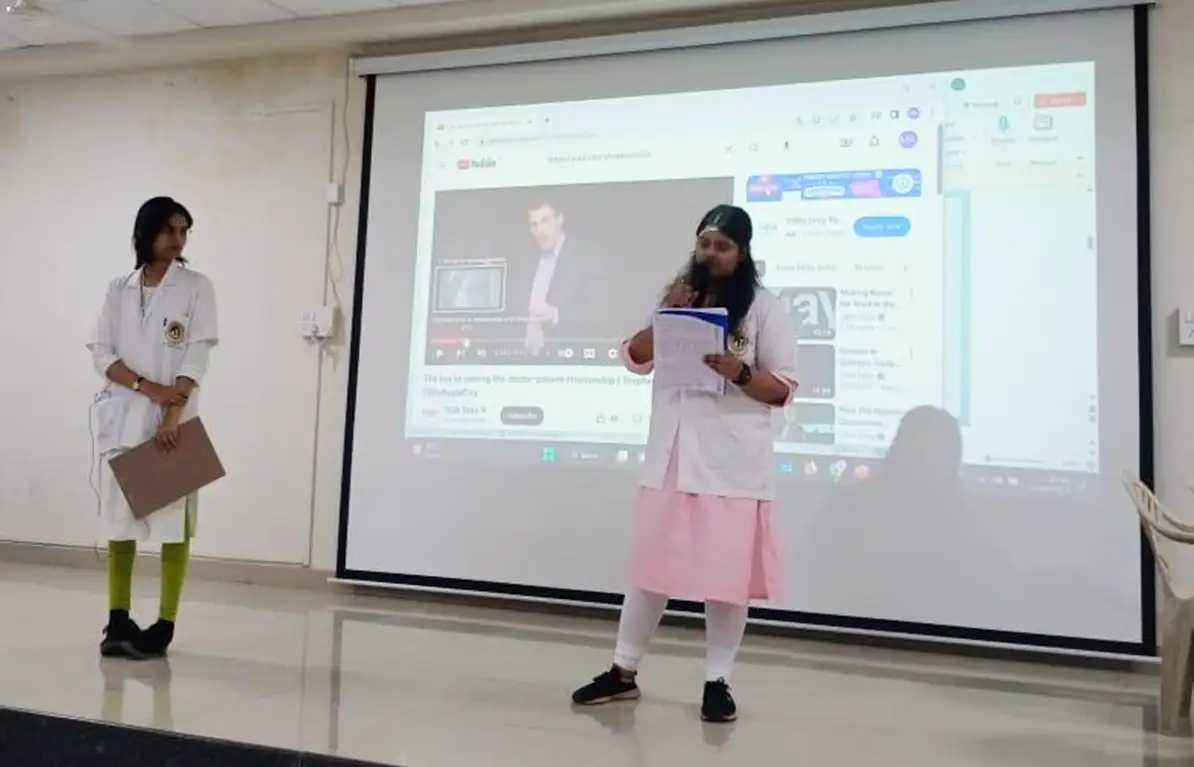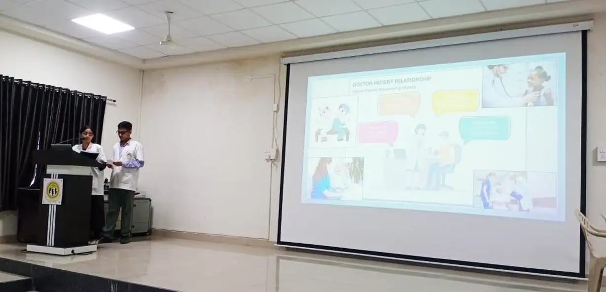 Department of Physiology conducted AETCOM on “1. Module 1.2: What does it mean to be a patient? 2. Module 1.3: The doctor-patient relationship.” MBBS Phase I 2022-23 Batch Students participated in Role Play, PPT, Skit, Personal Experience & Played Videos doctor-patient relationship by allotting students into two Teams named Kshamata & Jigyasa held on 21th April 2023 in between 9:00 to 11:00 AM in the Anatomy gallery Hall. Co-ordinated by Dr. Jyoti Khodnapur & Dr. Pallavi Kanthe