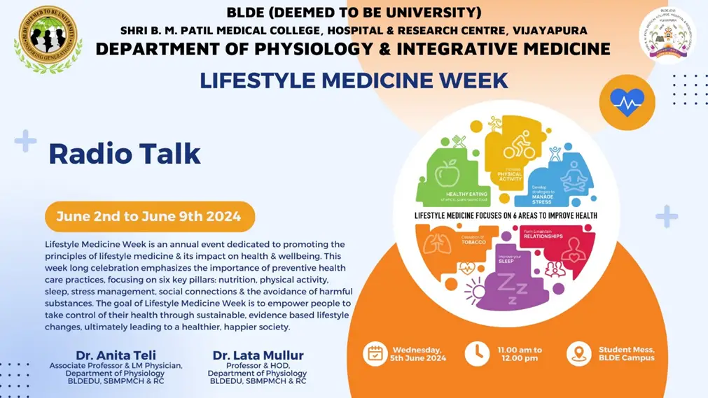 “Radio Talk- Lifestyle Modifications for healthy living”: This radio talk was given to create awareness among general public about Lifestyle choices for healthy living. The talk was aired in Akashavani Vijyapura on Wednesday at 5 PM.