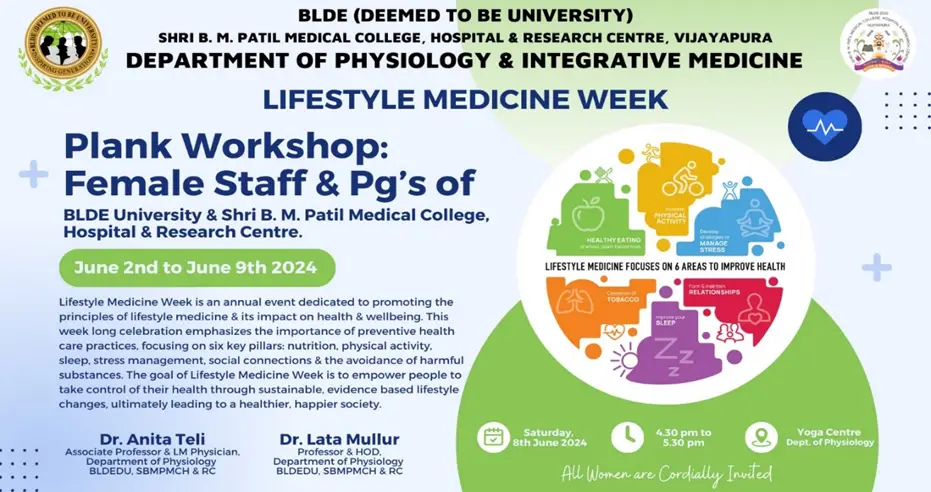 7. Plank Workshop : Female staff  & PG’s of BLDE Medical College 8th June 2024 Saturday – 4:30 to 5:30 pm Centre for Yoga & Exercise Sciences